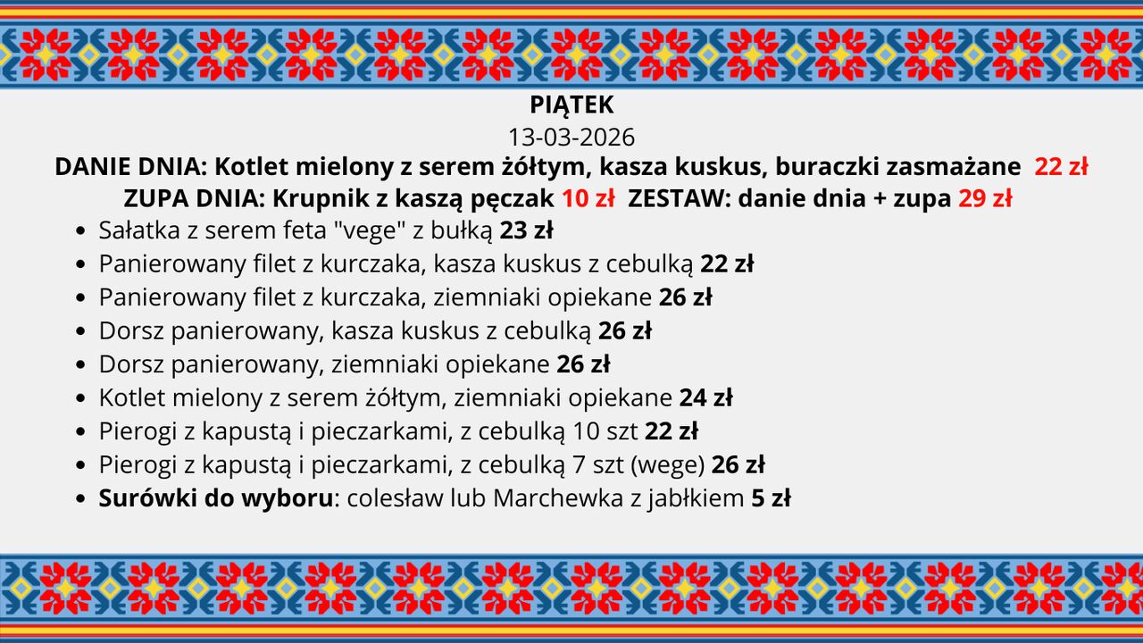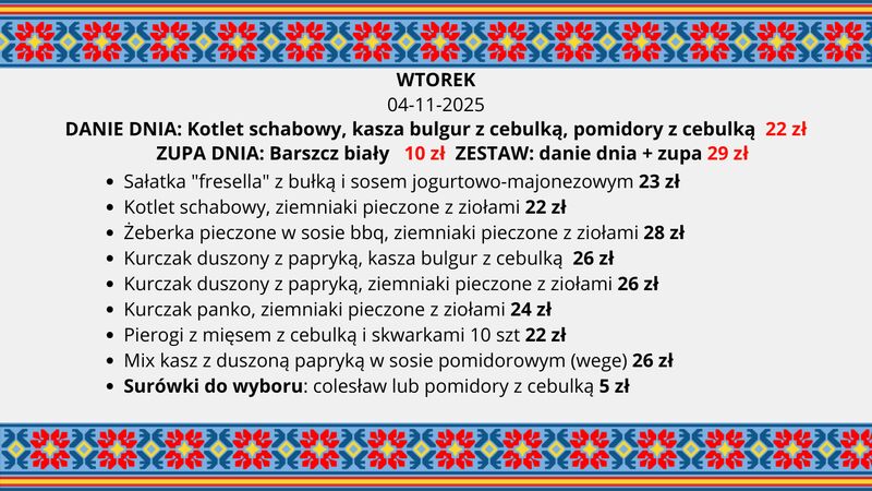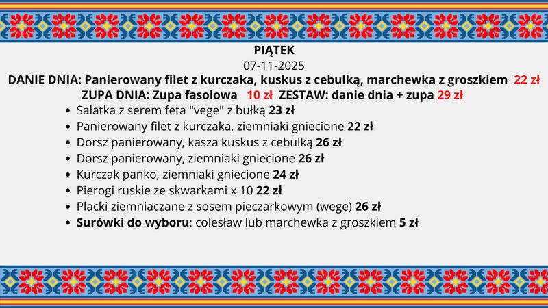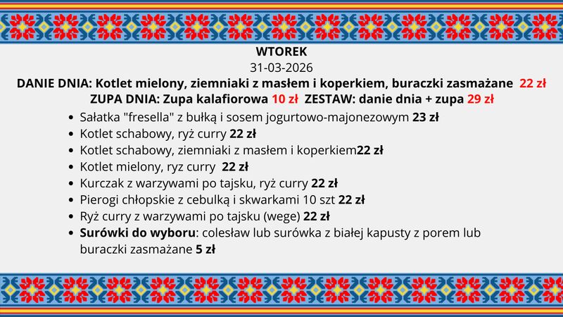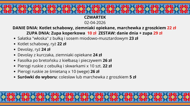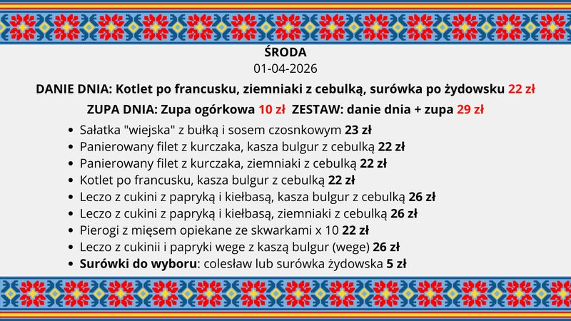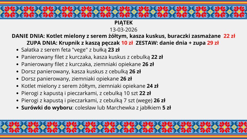 Starannie dobrana oferta obejmuje różnorodne dania, które zachwycą Twoje podniebienie. Oferujemy każdego dnia inne menu, składające się z wielu dań, przeciwstawiając się rutynie i kierując się różnorodnymi smakami i wymaganiami każdego klienta.