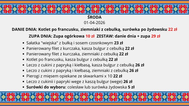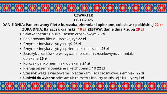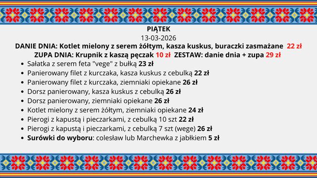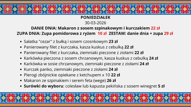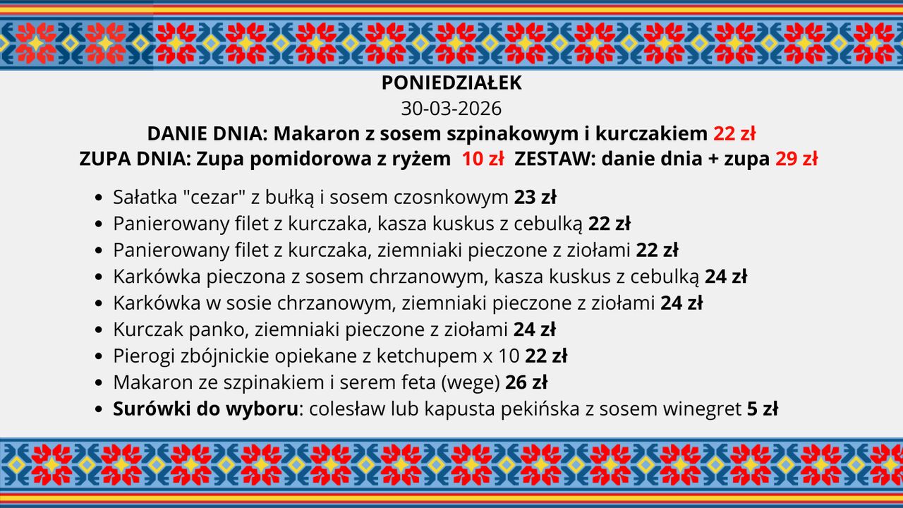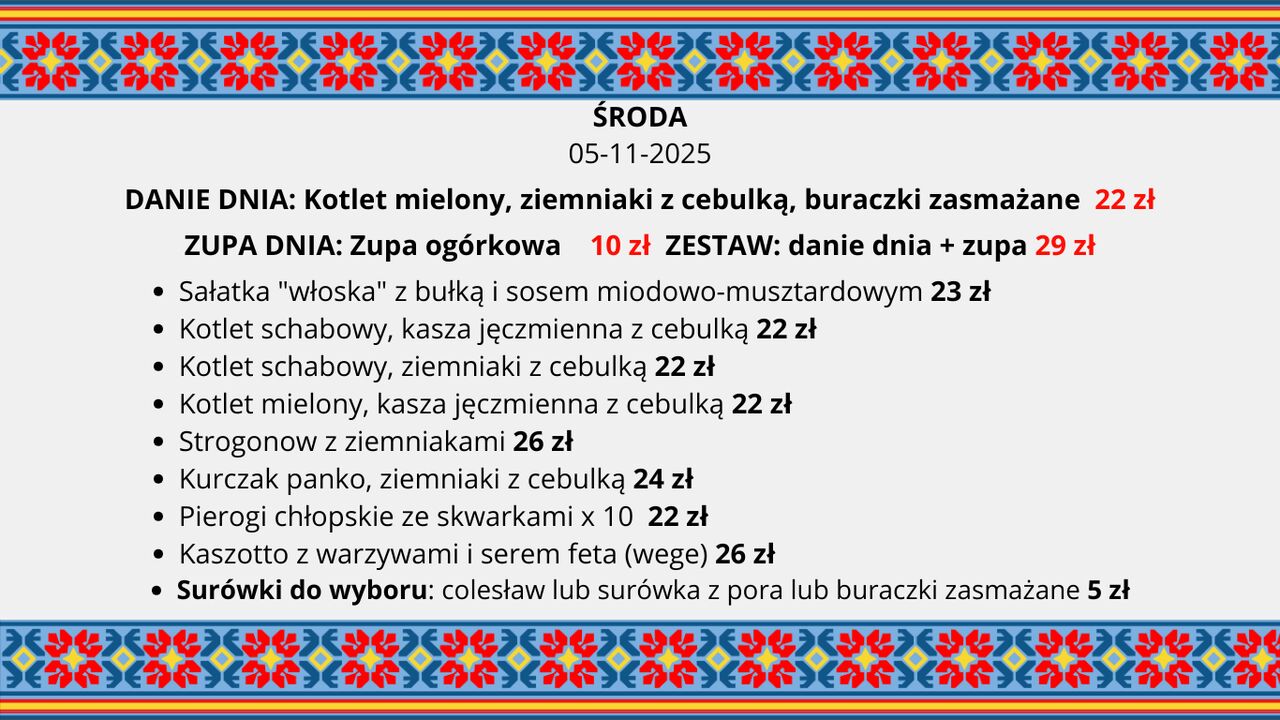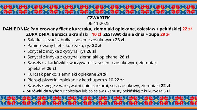 Starannie dobrana oferta obejmuje różnorodne dania, które zachwycą Twoje podniebienie. Oferujemy każdego dnia inne menu, składające się z wielu dań, przeciwstawiając się rutynie i kierując się różnorodnymi smakami i wymaganiami każdego klienta.